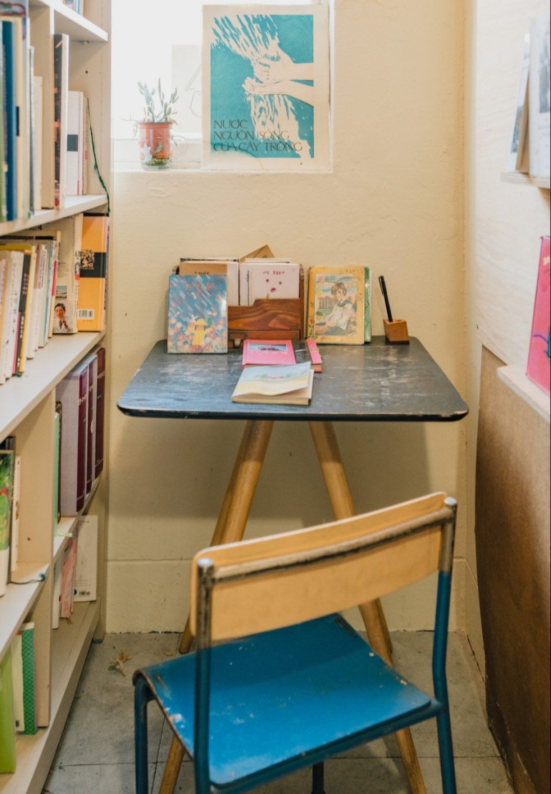 그곳은 다양한 책과 소품들로 가득 차 있어요.