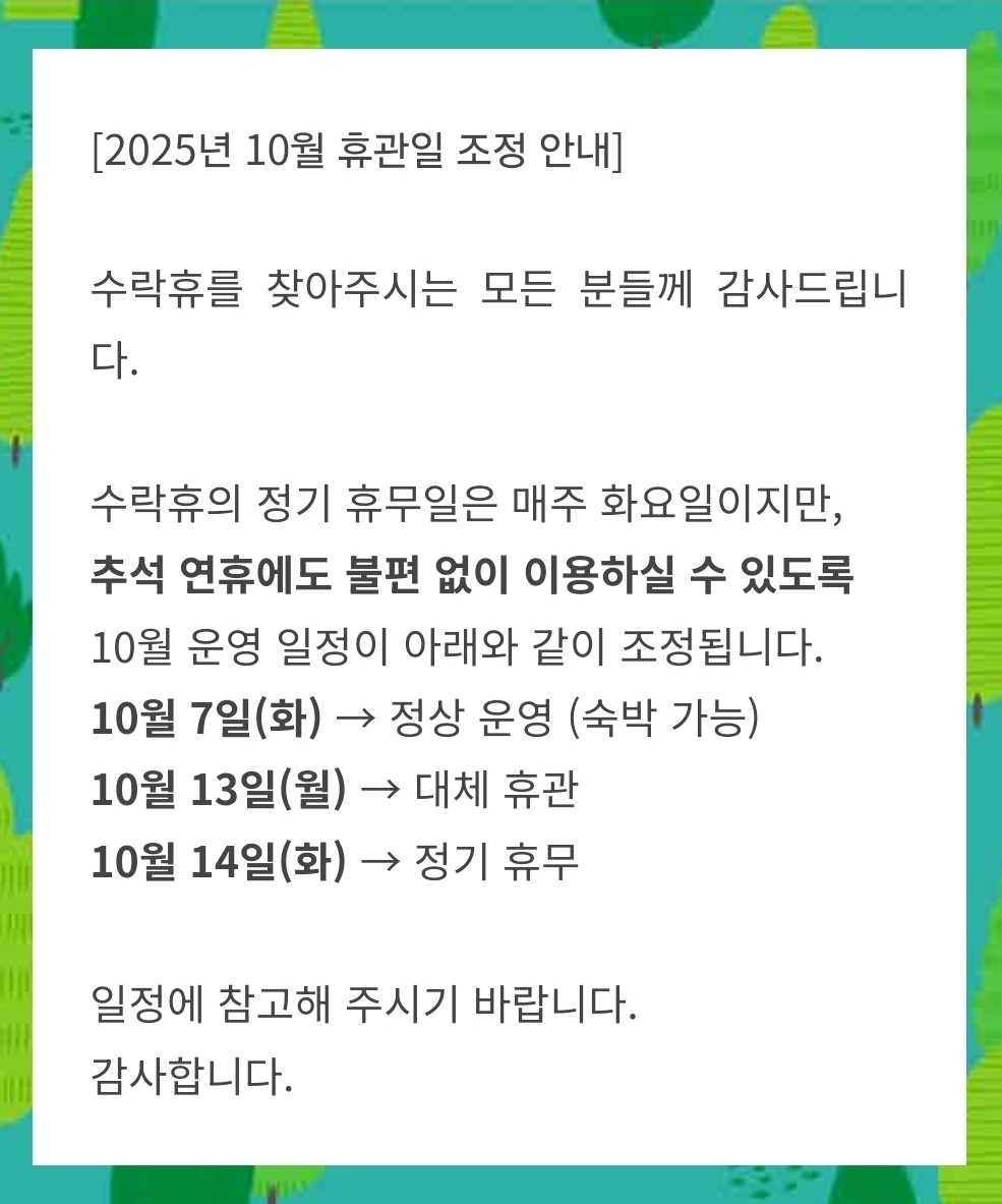 * 수락휴 자연휴양림 방문자센터: 상시 운영하며,