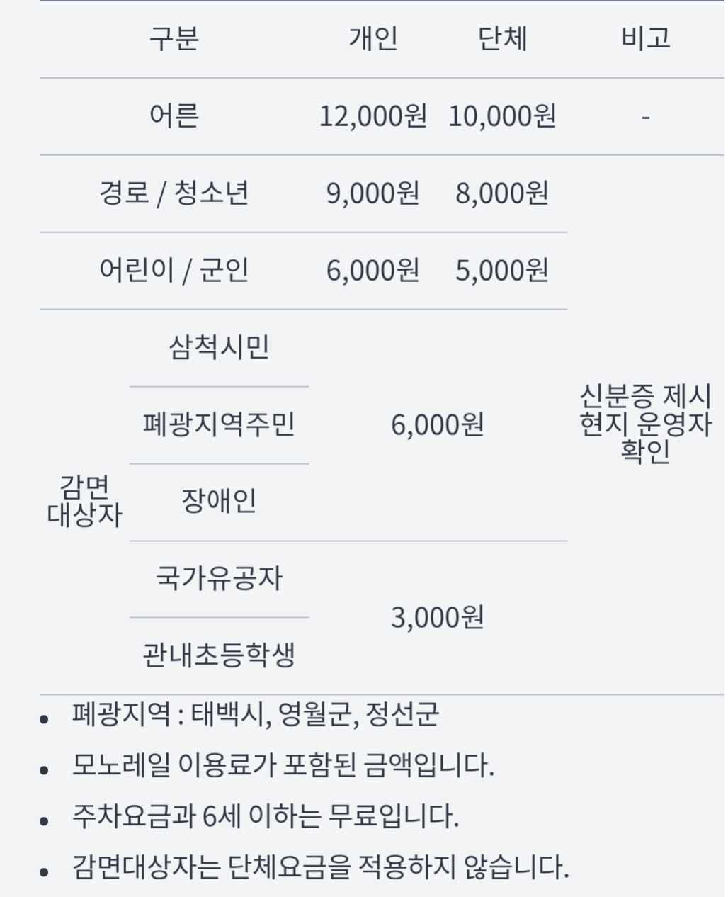 # 대금굴 이용 요금표